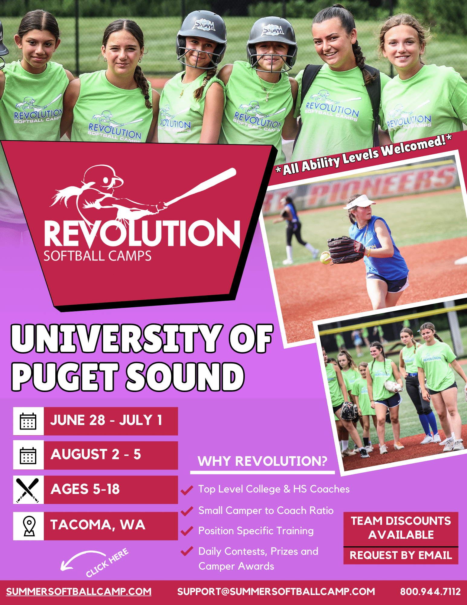 The Logger Softball Field is home to the University of Puget Sound Softball team. The surrounding facility features a newly renovated batting cage, bullpen, and team clubhouse. Spectators can also catch a glimpse of Mount Rainier in center field. We’re excited to host the Revolution Softball Camps at University of Puget Sound. Join us and have fun while improving your softball skills!